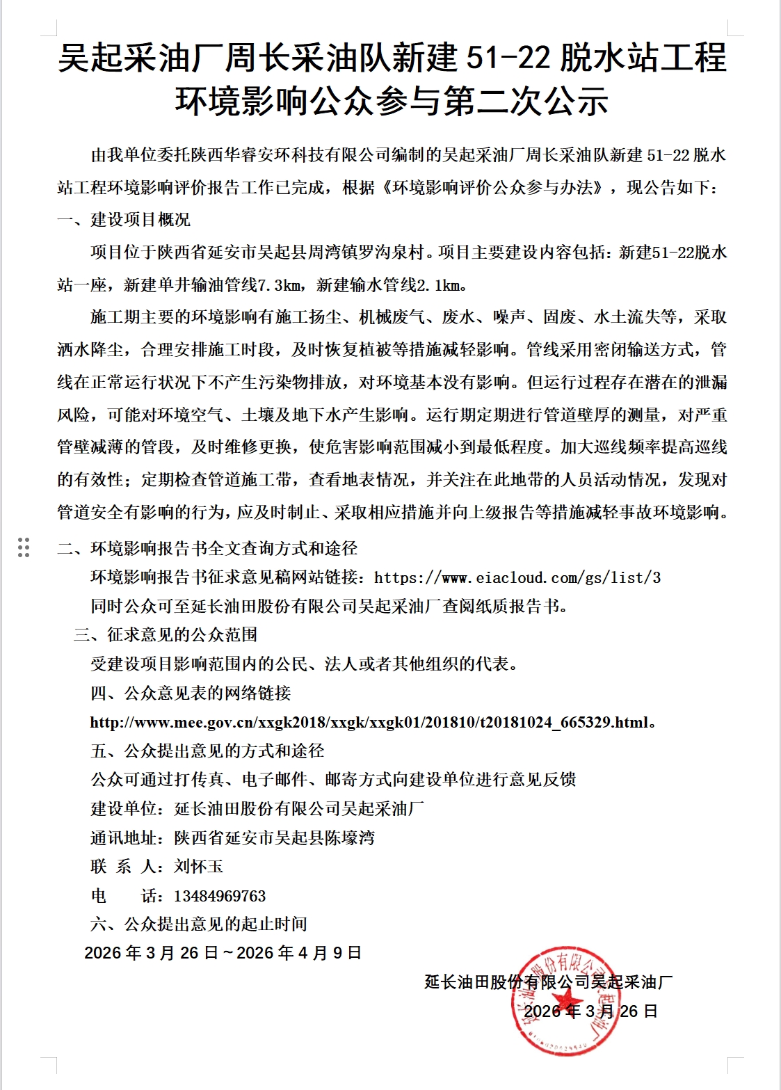 吳起采油廠周長(zhǎng)采油隊(duì)新建51-22脫水站工程環(huán)境影響公眾參與第二次公示